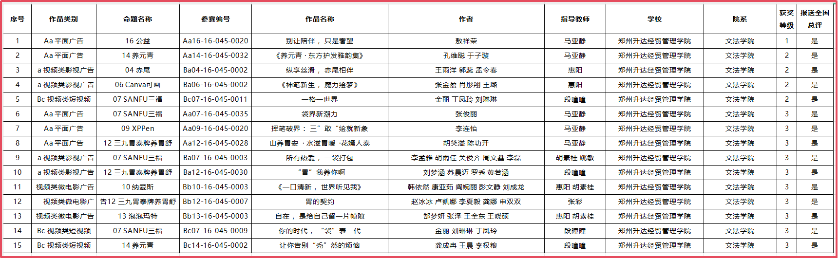 近日,第17届全国大学生广告艺术大赛评选结果正式揭晓。文法学院学生作品荣获全省一等奖1项、二等奖4项、三等奖10项,获奖学生覆盖新闻学、网络与新媒体、汉语言文学三个专业。马亚静、惠阳、段曈曈三位指导老师荣获“优秀指导老师”。