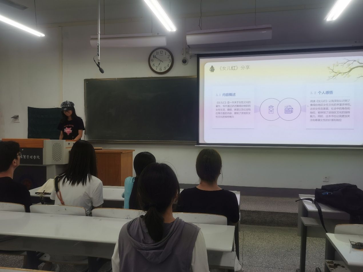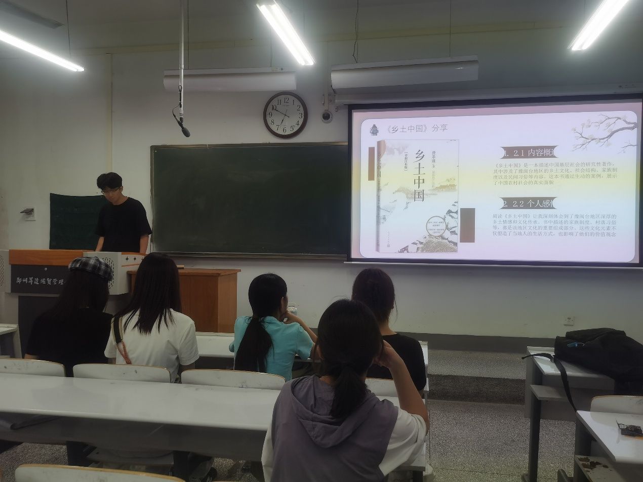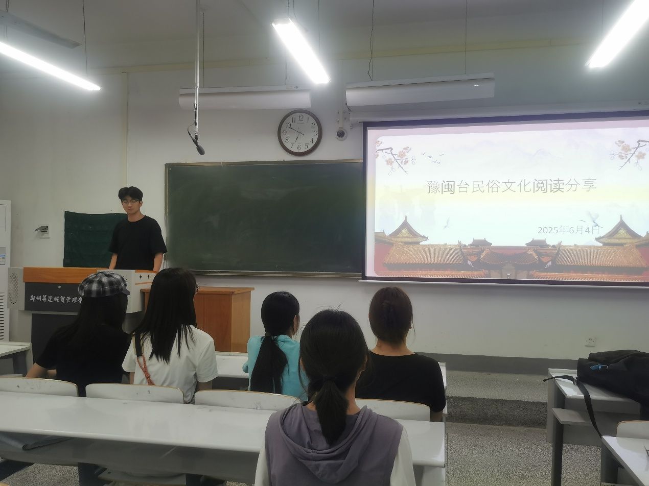 活动伊始,张钰强调豫闽台民俗文化相互影响、相互联系,阅读分享是探寻文化脉络、增强认同感的重要方式。接着,进入分享环节,社员们围绕《乡土中国》《女儿红》等作品,结合豫闽台民俗文化展开分享,社员们通过PPT展示,从内容概述到个人感悟,深入体会民俗文化中的内涵。随后进入交流环节,现场气氛热烈,社员们积极分享其感受并进行深入探讨,从豫闽台三地的民俗差异中找共性,在思维交互中深化对豫闽台民俗文化的认知。活动最后,张钰进行总结发言,她对这次阅读分享活动给予肯定,同时也鼓励大家在未来的日子中要继续保持对豫闽台民俗文化三地民俗文化的热爱,以更新颖的形式让大家感受豫闽台三地文化的韵味。