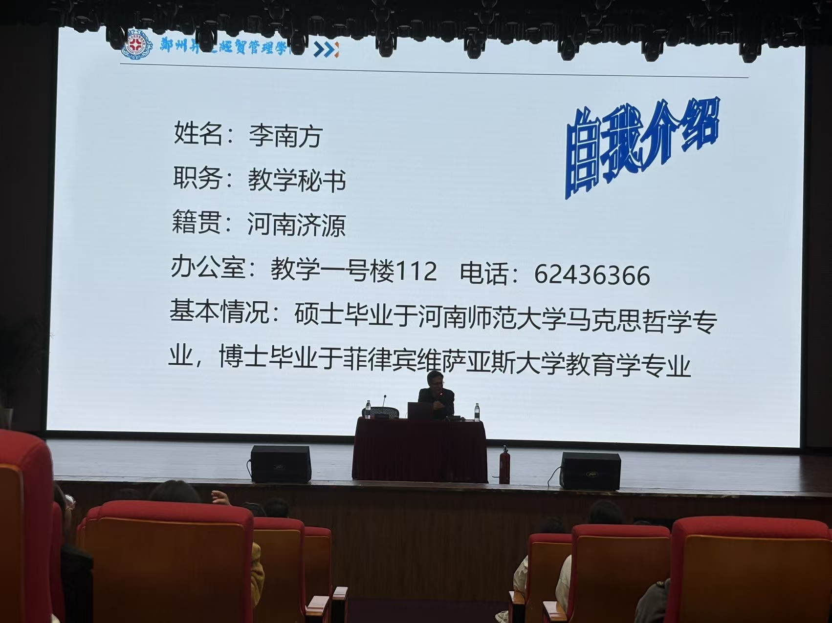 教学秘书李南方老师以“学有所成,习有所获”为主题,阐述大学生应掌握分析与解决问题的能力,详解考核、留降级、学位授予等教学规定,为新生适应大学教学管理提供指引。