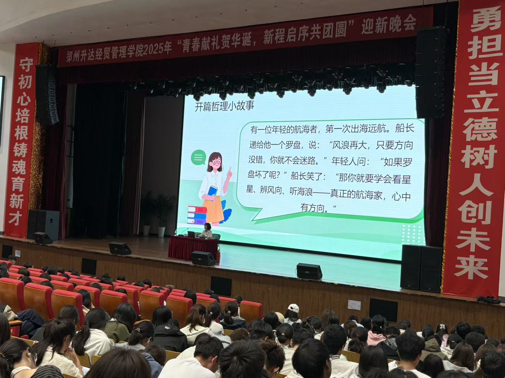 党委副书记兼团委书记郑玲玲以“扬帆启航·筑梦升达”为主题,围绕理想信念、安全、生涯规划等开展入学教育,提及8000步健身计划,寄语新生做昂扬、自律、有光的文法人。