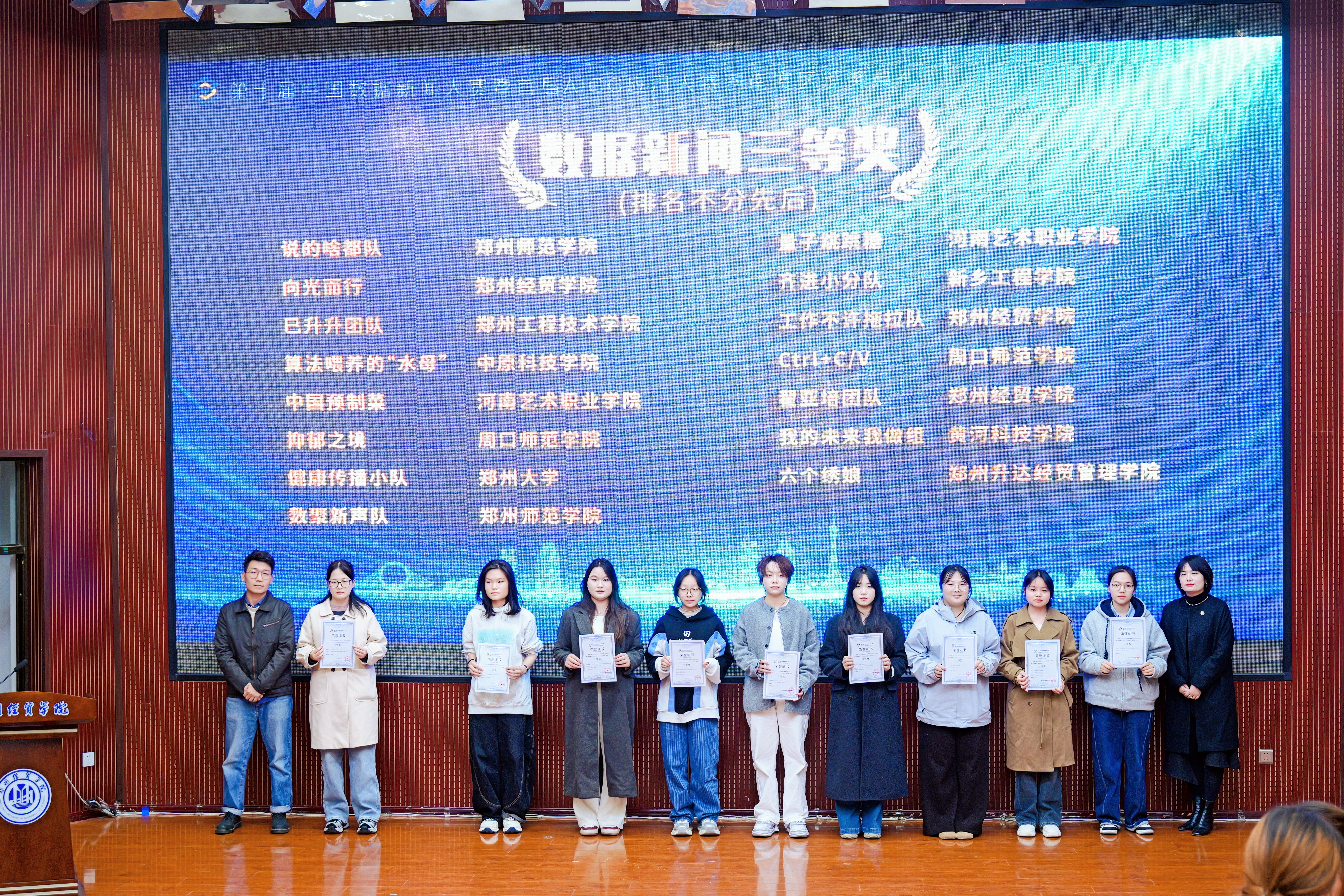 10月24日,第十届中国数据新闻大赛暨首届AIGC应用大赛河南赛区颁奖典礼圆满落幕。我校文法学院2023级新闻学本科班张秋粉、梅晓彤、赵晓蓓、赵俊青、林雅茹、邹长倩6位同学的数据新闻作品《妥妥中国高定!“数”说非遗刺绣》荣获河南赛区数据新闻赛道三等奖,丁新湍老师获优秀指导教师称号。