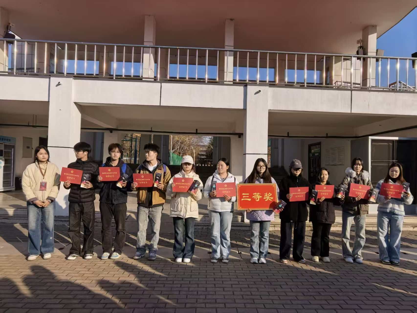 主持人讲解完比赛规则后,活动正式拉开序幕。“一圈到底”环节中,队员们手拉手默契配合,呼啦圈在队列中如游蛇般灵活穿梭;“进击的石头剪刀布”赛场,跳跃与猜拳轮番上演,胜负之间尽显新时代青年的青春与活力;“多人多足”项目中,各队步调一致、协同向前,摔倒后迅速起身的身影,淋漓尽致地诠释着永不言弃的拼搏精神;“猜词”环节,描述者巧妙运用动作与语言提示,猜词手们反应敏捷、默契配合,在欢声笑语中凝聚思想共识,传承爱国初心;“毽子游戏”时,彩色毽子在队员们脚尖、膝盖间轻盈跳跃,传递着新时代团干部互帮互助、协同共进的喜悦。经过激烈角逐,最终第七组拔得头筹,荣获一等奖,第四组摘得二等奖,第九组获得三等奖,其余参赛队伍均获优秀奖,党委副书记郑玲玲、团委副书记于晔和团委副书记袁艺阁为获奖选手颁奖。
