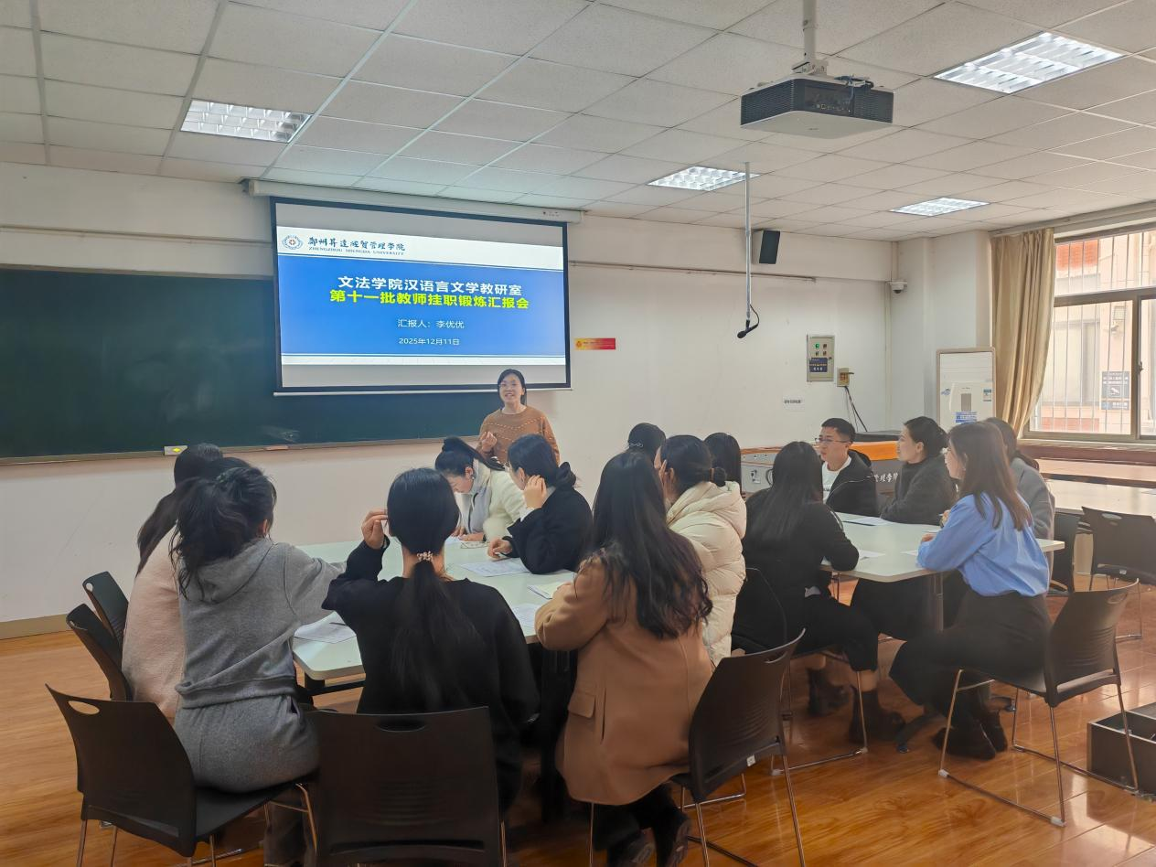 为深化产教融合、推动实践教学改革,2025年12月11日,文法学院在商管楼318举办了第十一批教师挂职锻炼汇报会。本次汇报会聚焦于“传统文化赋能企业品牌形象升级与传播策略研究”课题,由汉语言文学专业李优优副教授作主题分享,专业教师代表参加研讨。
