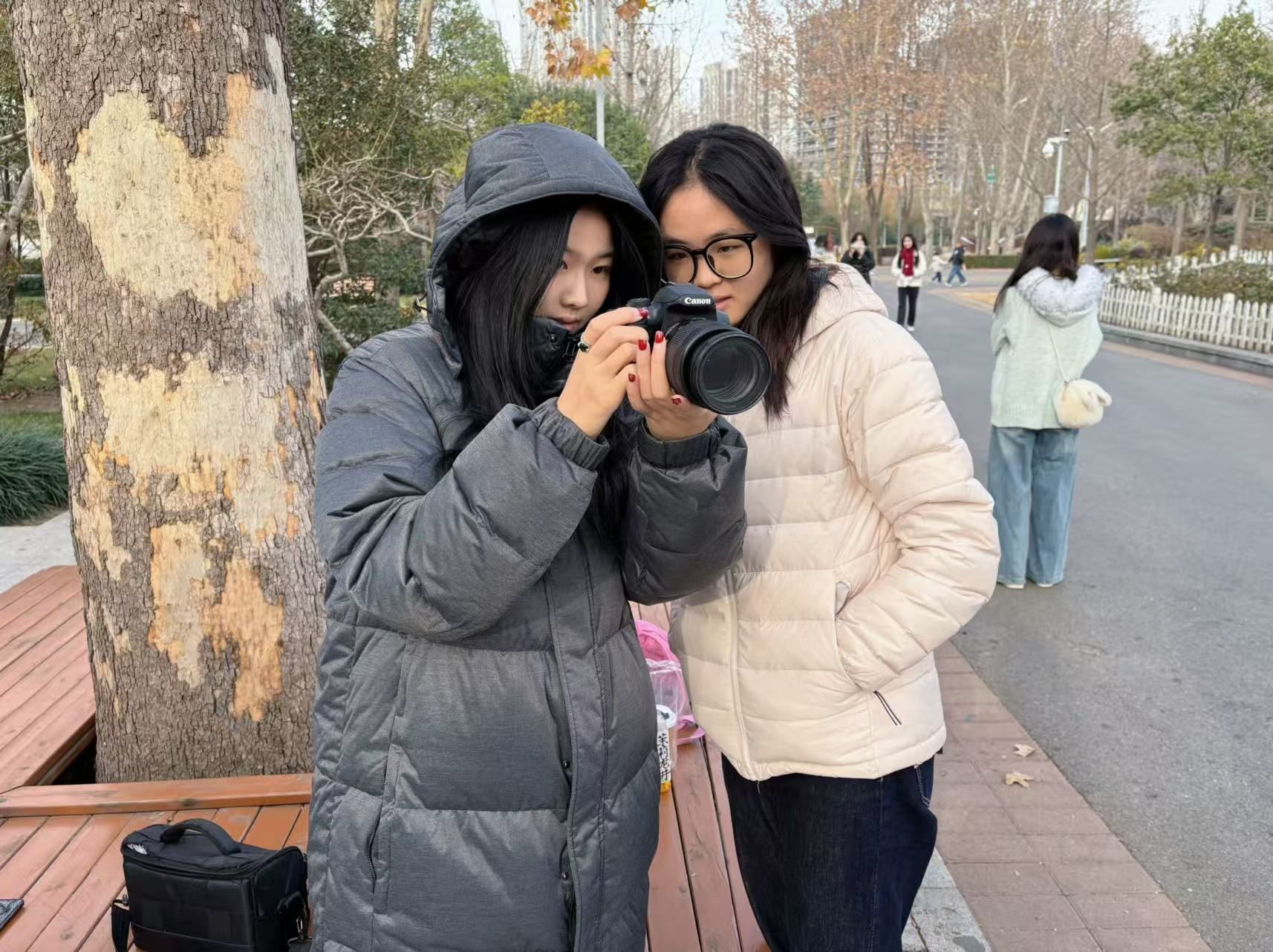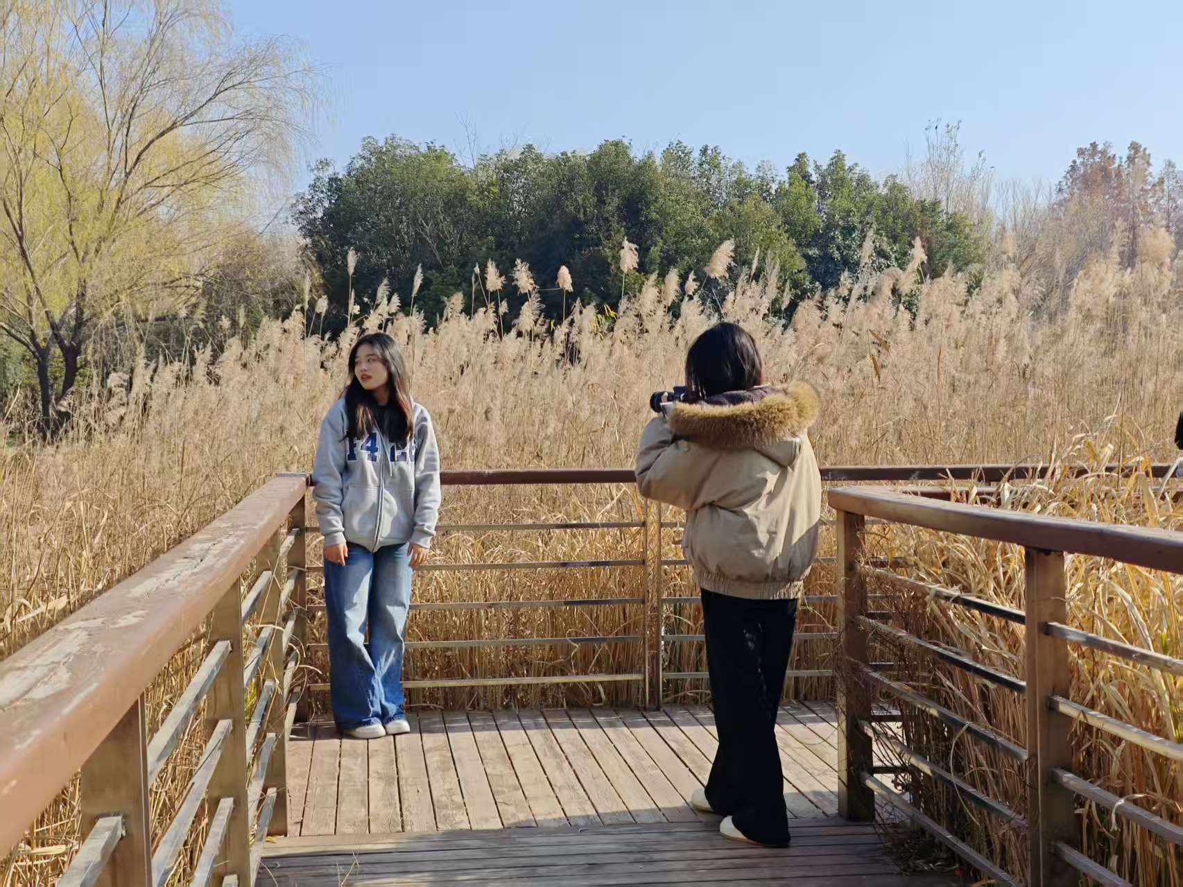 冬日的郑州植物园景致鲜活,芦苇疏朗、光影错落,为摄像实践搭建了天然且多元的实操场景。抵达园区后,各班级快速以小组为单位明确分工,或聚焦自然景观打磨景别切换技巧,或捕捉林间光影探索光线运用方法,或围绕同伴实践瞬间练习镜头叙事,各组有序推进拍摄任务,现场专注高效、氛围浓厚。