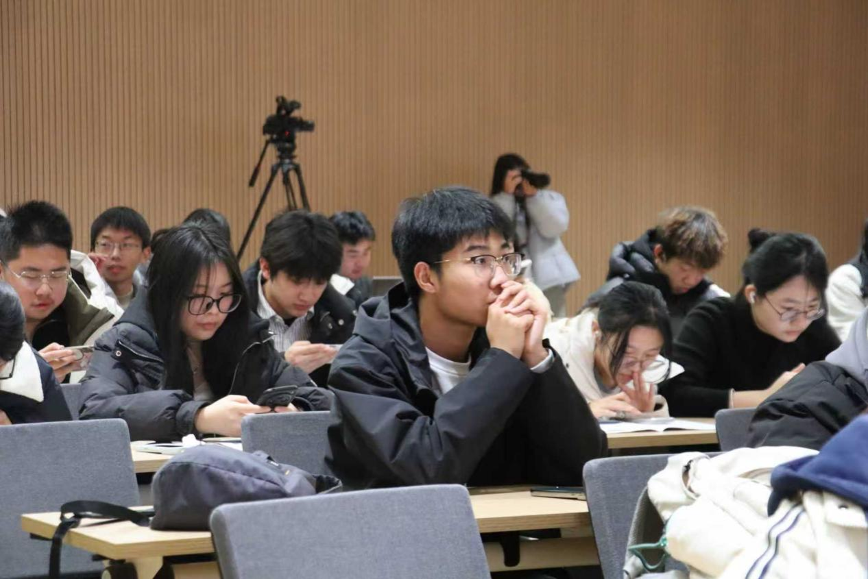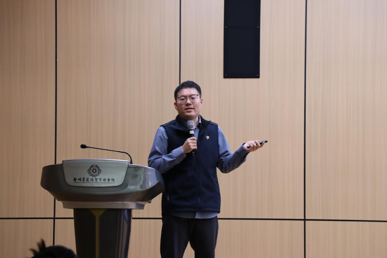 讲座伊始,贾永标分享了自己从校园记者成长为媒体主编的成长历程,并以自身经历,鼓励同学们在日常中主动培养新闻敏感与思维习惯。随后,贾永标结合“预制菜”这一时代背景,解析了财经新闻采写流程的变革,并结合自身采访调研故事,向同学们阐释新闻实践中“解放生产力、释放想象力”的关键作用。