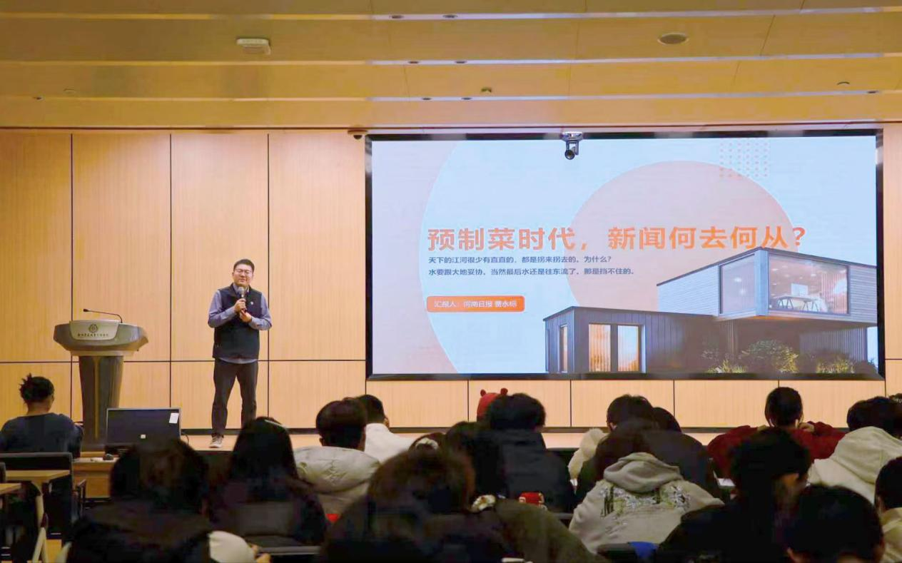 12月10日下午,文法学院在新图书馆第一报告厅举办新闻学和网络与新媒体专业认知讲座,河南日报社财经全媒体中心主编贾永标担任主讲嘉宾。讲座主题为“预制菜时代,新闻业何去何从?”讲座由文法学院教研室专任教师丁新湍主持,温锡华、赵冰洁老师及2025级新闻学、网络与新媒体专业全体学生参加。