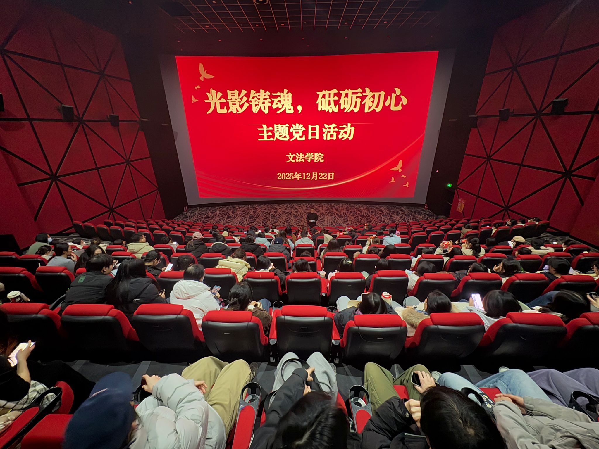 为持续巩固拓展主题教育成果,深入推进党史学习教育常态化长效化,激励广大师生党员铭记光辉历史、传承红色基因、砥砺奋斗精神,2025年12月22日,文法学院党委组织学院全体师生党员开展“光影铸魂,砥砺初心”主题党日活动,集体观看红色影片《志愿军:浴血和平》,活动由文法学院党委书记刘晓川主持。