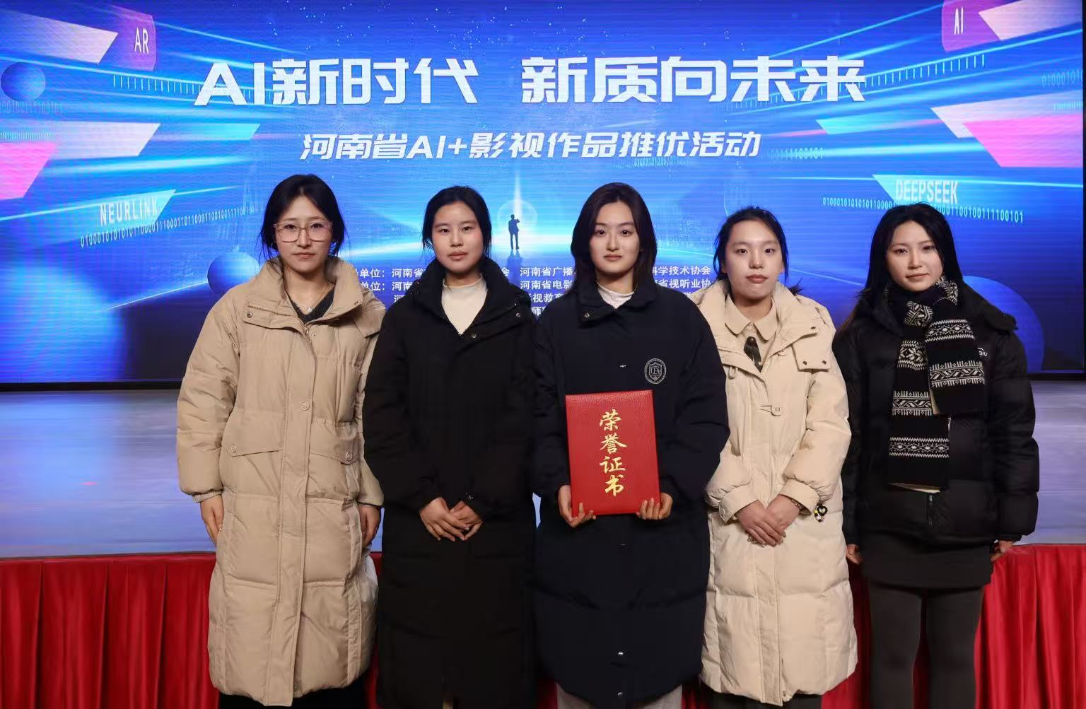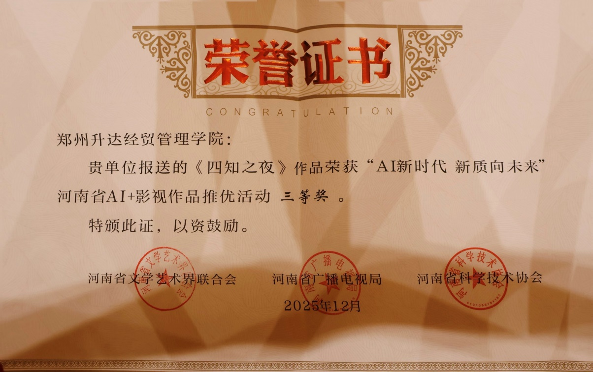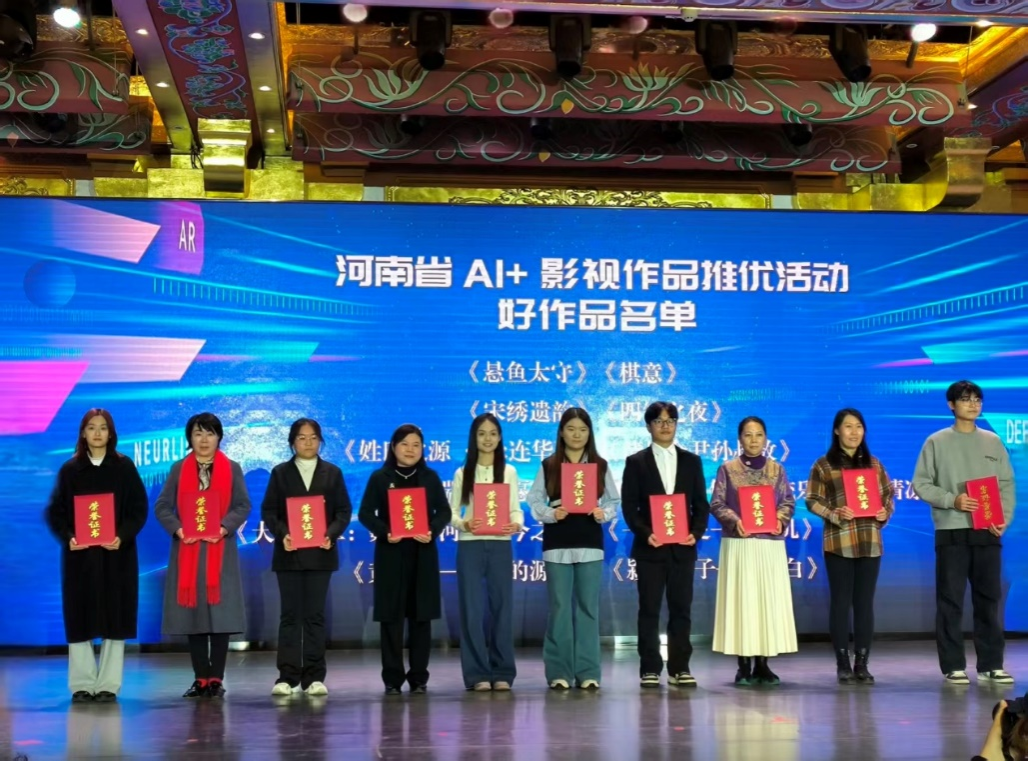 12月20日,在洛阳举行的“AI新时代新质向未来”——河南省AI+影视作品推优盛典暨AI+洛绣艺术展活动中,由我院惠阳、张彩两位老师指导,肖彤翔、张金盈、王璐等同学创作的AI影视作品《四知之夜》,从全国众多参赛作品中脱颖而出,荣获大赛三等奖。