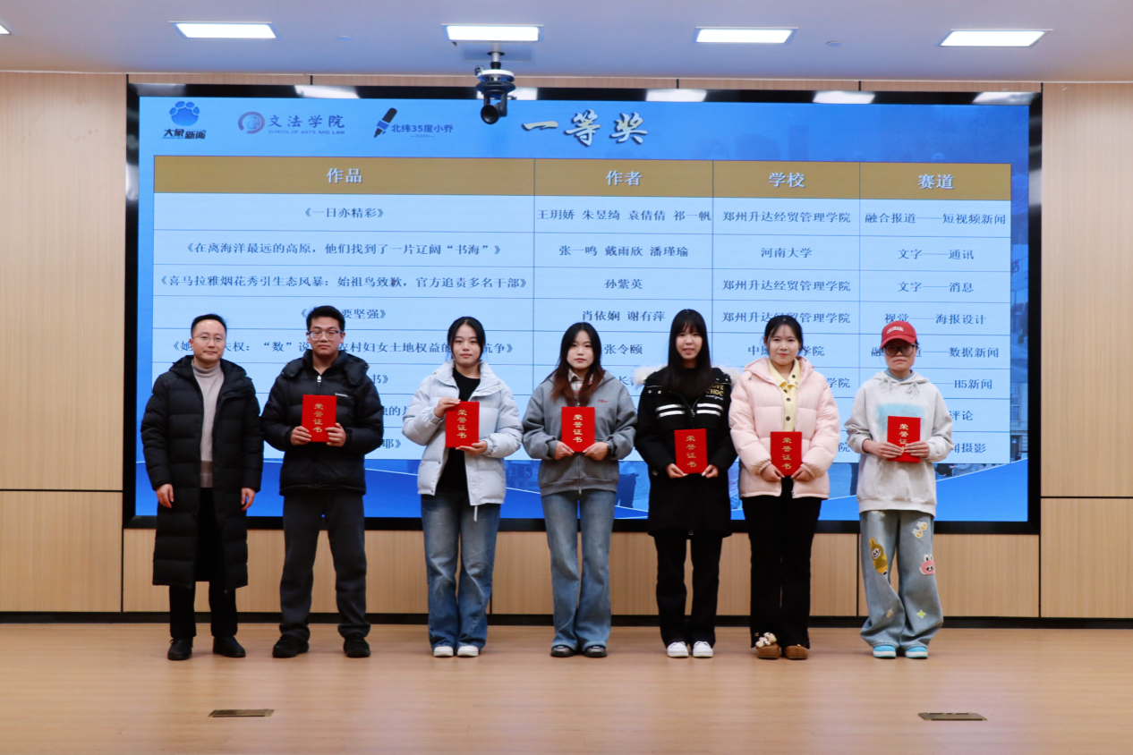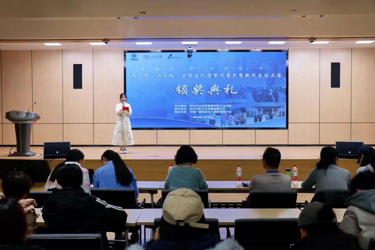 12月30日,第二届“小乔杯”大学生记者节闭幕式暨新闻采写大赛颁奖典礼在郑州升达经贸管理学院新图书馆二楼1号报告厅举行。文法学院副院长赵严俊、党委副书记郑玲玲、新闻学教研室主任赵静及校内外获奖师生代表出席活动。