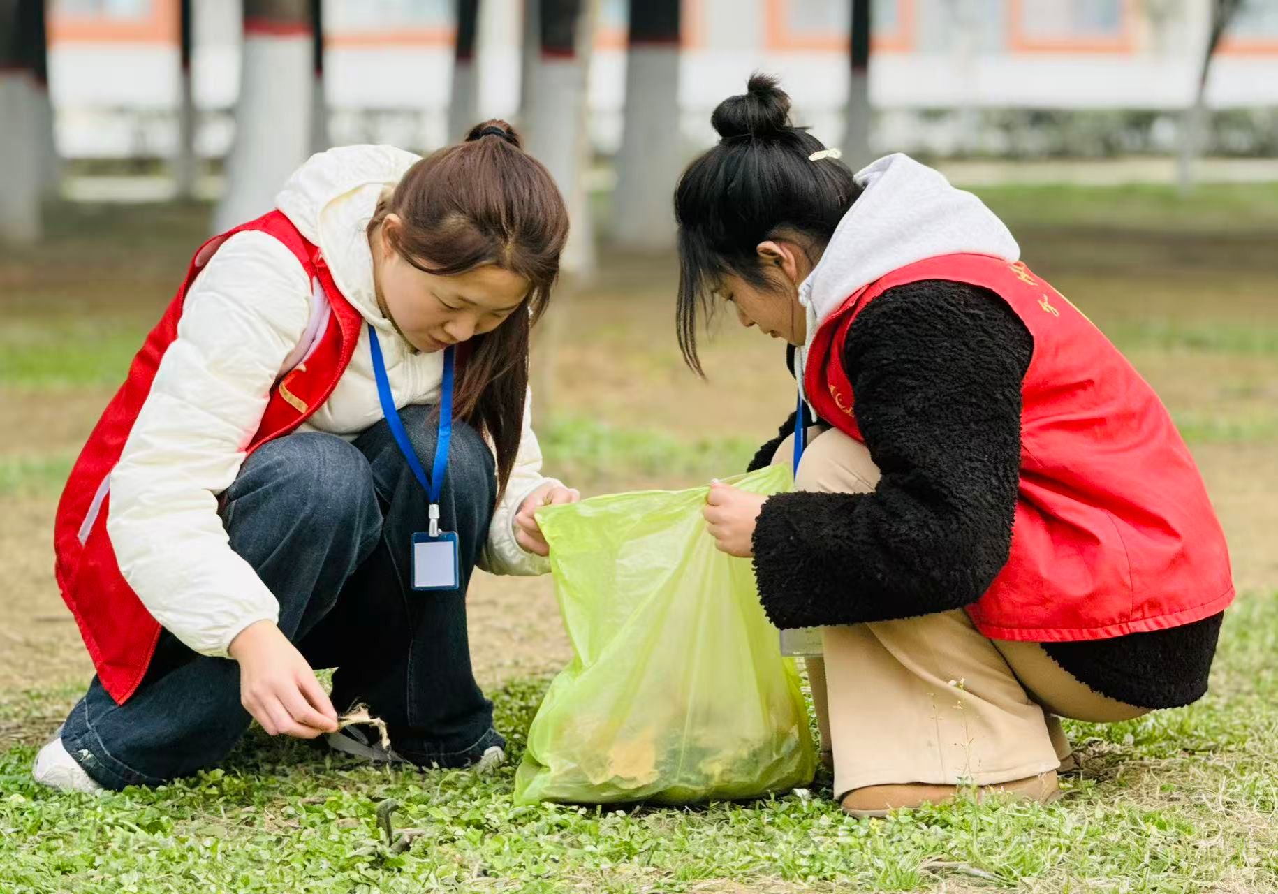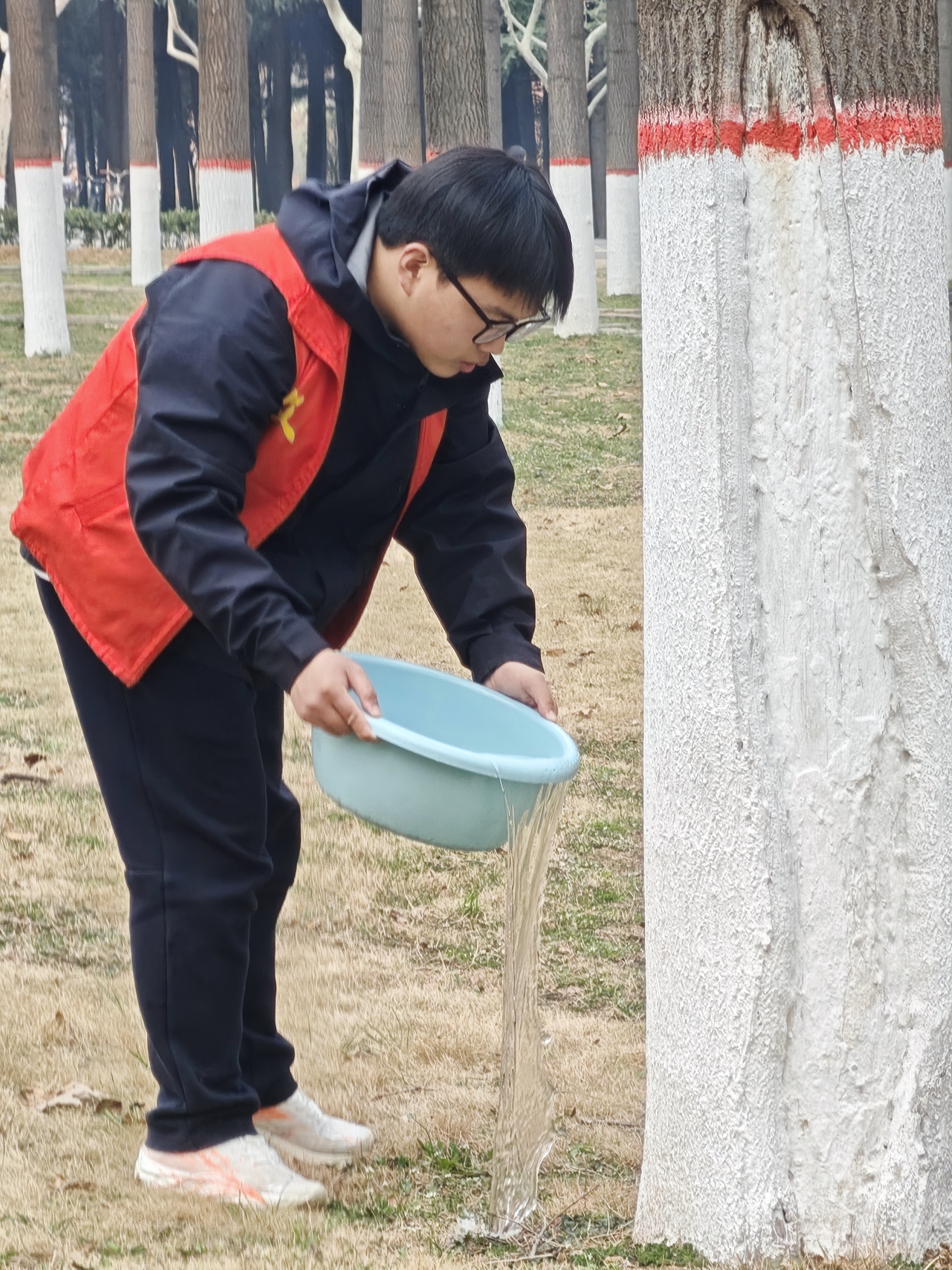 活动伊始,联络服务部部长张萌与权益部部长崔舒雅围绕校园绿植日常养护及生态环境保护等主题,向在场同学系统讲解了绿植养护的基本知识,并深入阐释了护绿行动在美化校园环境、涵养校园生态、践行绿色发展理念中的重要意义,引导大家树立尊重自然、爱护自然、守护自然的意识。随后进入实践环节,志愿者们分工明确、协作有序,以实际行动践行护绿使命:大家手持清洁工具,沿后山林间道路细致清理纸屑、塑料瓶等生活垃圾,认真排查每一处卫生死角;同时提着水桶为树木浇灌补水,用点滴行动呵护草木生长。活动现场,同学们干劲十足、热情高涨,弯腰捡拾、提水浇灌、相互配合,处处洋溢着团结奋进、守护绿色的热烈氛围,以青春行动为春日校园增添了生机与活力。