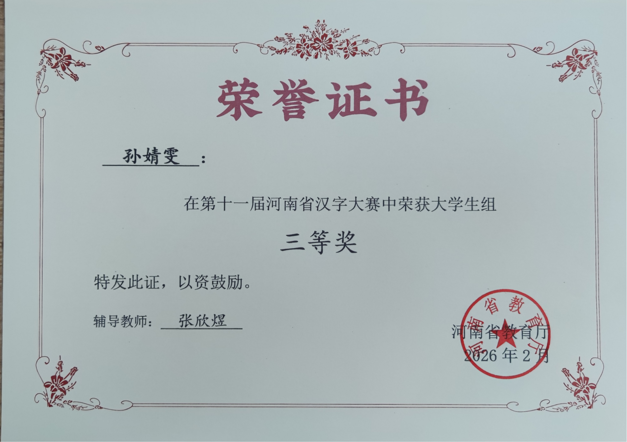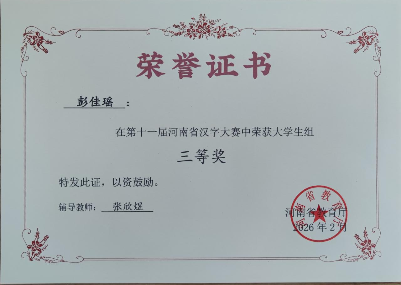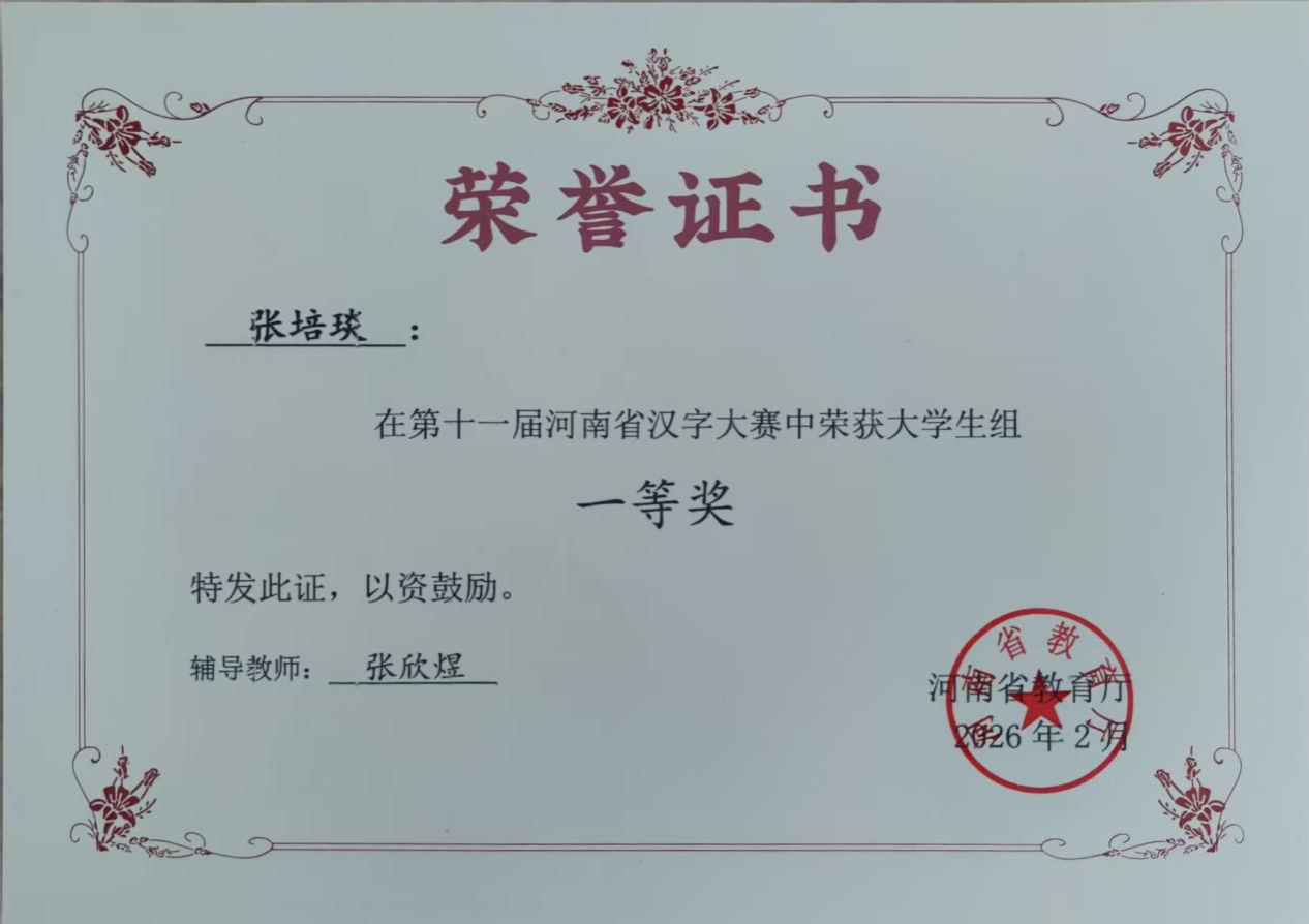 近日,由河南省教育厅主办,河南日报社、中国移动通信集团河南有限公司等单位共同承办的第十一届河南省汉字大赛决赛隆重举行,来自全省100多所高校的选手齐聚一堂,共赴文字盛宴。我校语委积极组织校级初赛,在校领导关怀支持下,经严格选拔,3名优秀学子代表我校参赛,最终斩获佳绩。