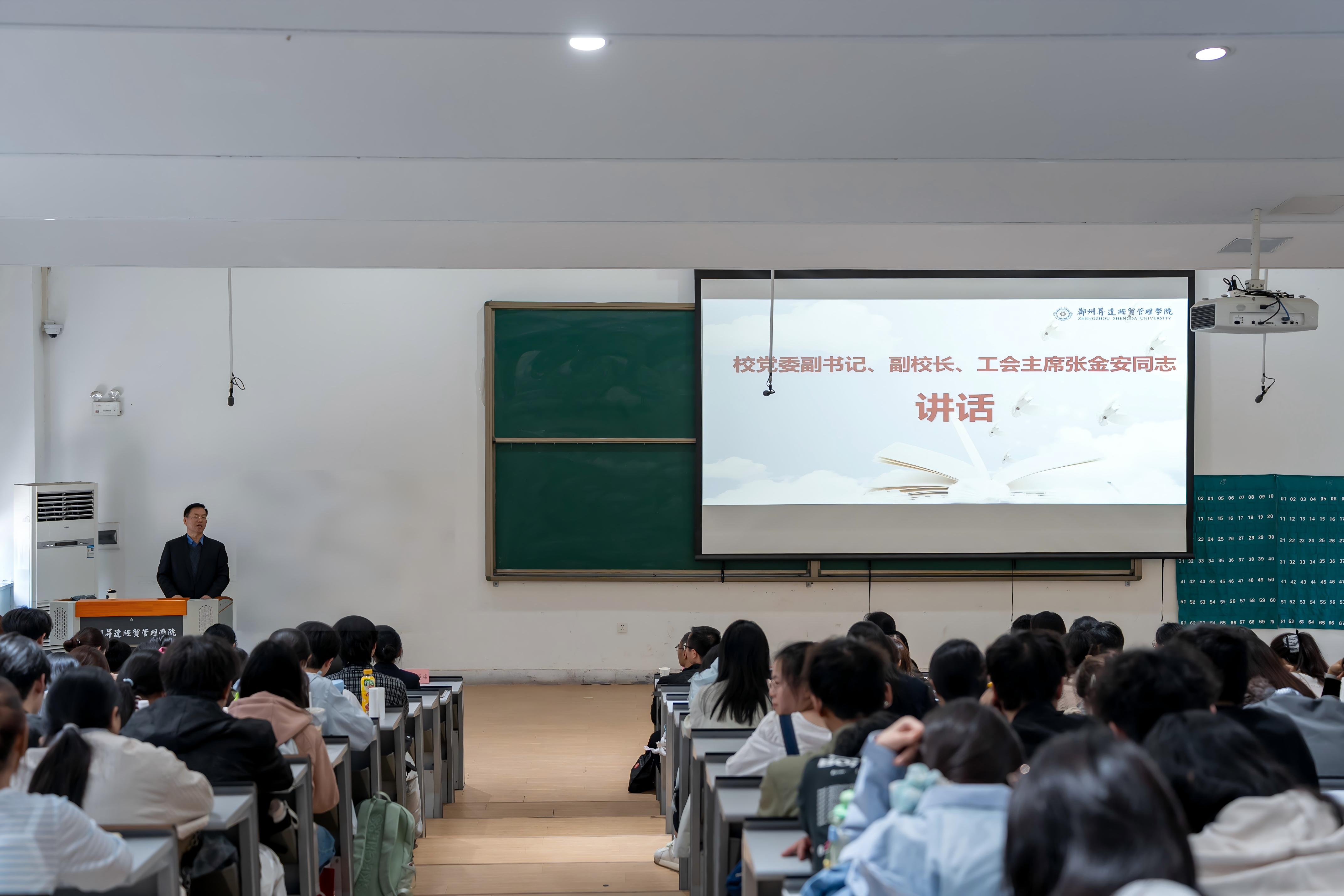 为深入贯彻落实河南省教科文卫体工会《关于开展“书香润心・阅见未来”2026 年度职工全民阅读系列活动的通知》文件精神,深耕书香校园建设,厚植人文育人底蕴,持续涵养优良师风校风,引导广大教职工在墨韵书香中淬炼师德修养、精进育人本领、丰盈精神世界。4月23日下午,由校工会主办、文法学院工会承办的 “书香润心・阅见未来” 教职工读书分享会于教学1 号楼 118 室圆满举办。校党委副书记、副校长、工会主席张金安出席活动并讲话,文法学院院长段丰乐、党委书记刘晓川、校工会办公室主任王凯、文法学院党委副书记郑玲玲及各分工会代表、学生代表齐聚一堂,共赴这场书香之约。