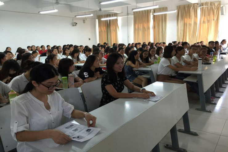 赵严俊老师对学生们顺利进入大学表示欢迎,并介绍了与会老师。王倩老师和毛玉凤老师做主题报告。王倩老师向同学们首先介绍学前教育专业背景及面临的历史机遇,坚定同学们的专业信心;王老师还就学前教育专业的培养目标和要求、就业岗位及发展方向、专业课程体系及校内外实训条件等问题进行了细致的讲解,王老师带领大家做“感恩的心”手语操使自己的报告达到了高潮!随后,毛玉凤老师从“为什么学习、学习的必要性和如何进行专业课学习”等三个方面为同学们进行了生动的介绍,让同学们知道了如何进行专业课学习、如何制定学习规划、如何进行有效的自我管理。在近两个小时的报告中,同学们都全神贯注认真听记,不断传出阵阵笑声,刚进教室时茫然的表情释然了许多。