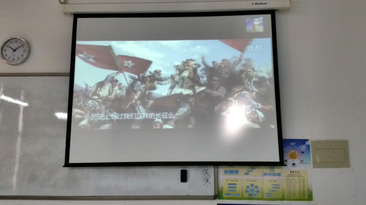活动开始前由14汉本团支书作简要讲解,然后让大家看《长征》的电影和红军长征胜利80周年习近平讲话。在观看电影的时候,同学们被红军艰难困苦却还勇往直前的精神所感动,看到红军们四渡赤水、巧渡金沙江,不禁心生敬意。在电影播放期间,教室里雅雀无声。电影结束时,有些同学的眼眶还是红的。