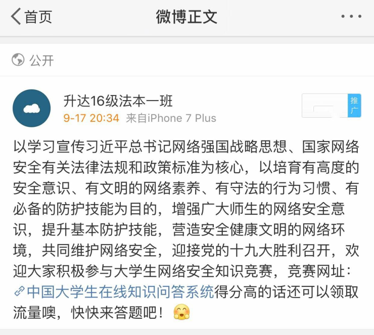 各支部按照部署,立即组织学生开展“网络安全知识宣传”班会,并要求各班通过QQ群、微信群等方式通知到每一名同学。辅导员和班委还列举实际案例,警示学生。同学们积极响应活动号召,以手机为工具,以新媒体客户端为平台,多次在QQ群、微信群分享网络安全的主题内容,同时分享其他高校有关网络安全宣传周开展的一些活动,积极参与到互动中。有些班级通过制作网络安全PPT,以宿舍为单位进行观看、讨论,在宿舍中营造起网络安全的气氛。还组织学生参加“全国大学生网络安全知识竞赛”并号召全体学生通过学院微信微博公众号、电子显示屏等自觉学习网络安全信息相关知识。