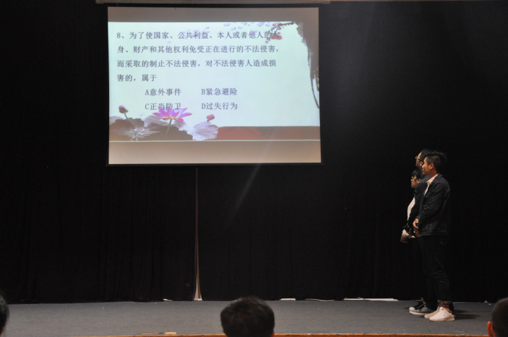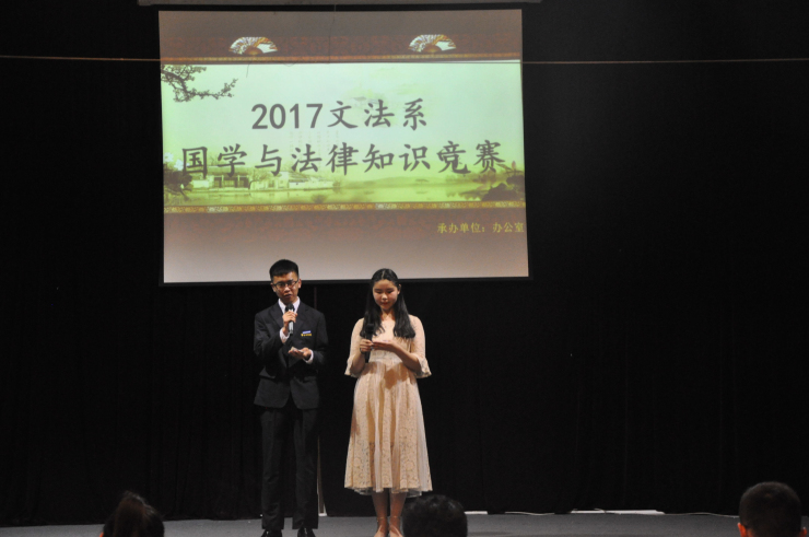 为了开阔同学们的视野,增强学习积极性、主动性,增加法律知识,提高法律素养,我系特于2017年4月17日下午6点30分在龙湖报告厅举办了国学与法律知识竞赛。出席本次大赛嘉宾有:文法系14级团总支书记刘建辉老师,团委副书记孙诗雯、赵河扬,学生会主席方帅,副主席王倩文、任静静、梁帅,文法系第14届办公室主任谢依依、副主任刘雪。我系16级全体同学到场观看。