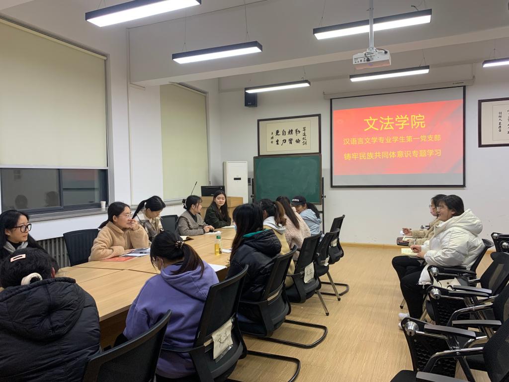 为深入贯彻落实习近平总书记关于民族工作重要论述,以及党中央关于新时代爱国主义教育和铸牢中华民族共同体意识的有关部署,12月9日下午,文法学院汉语言文学专业学生第一党支部在教学1号楼314开展了“铸牢中华民族共同体意识”主题教育活动。活动由支部书记张甜梦老师主持,支部全体成员参加活动。