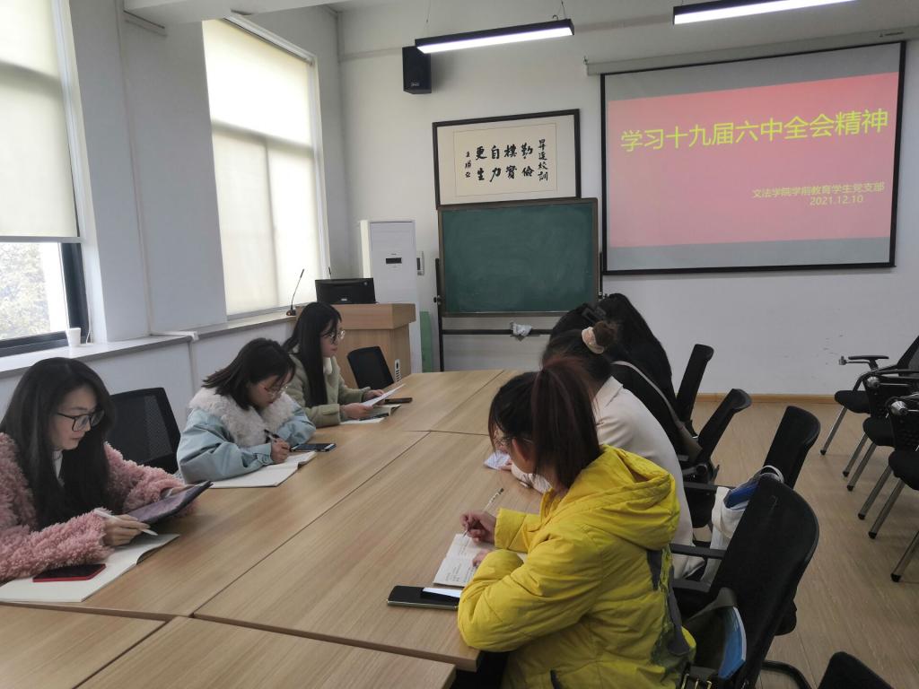 为深入学习贯彻党的十九届六中全会精神,引导广大党员师生深刻领会和把握其丰富内涵,文法学院学前教育专业学生党支部于12月10日在教学1号楼314办公室开展以“学习十九届六中全会精神”为主题的学习活动。此次活动由支部书记王卫丽老师主持,党支部全体党员同志参与。