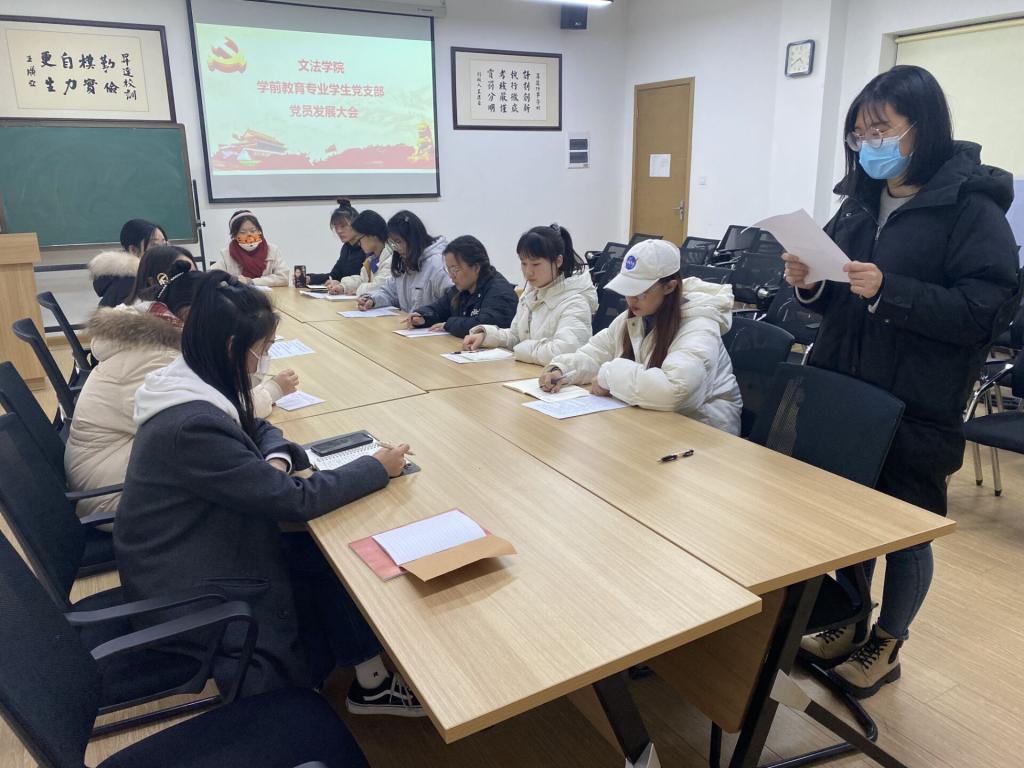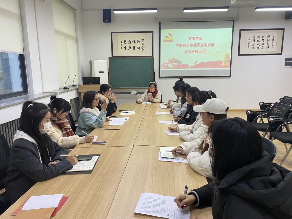 2021年12月23日下午在1号楼314会议室,文法学院学前教育专业学生党支部召开党员发展大会,会议由支部书记王卫丽老师主持,全体师生党员参加。