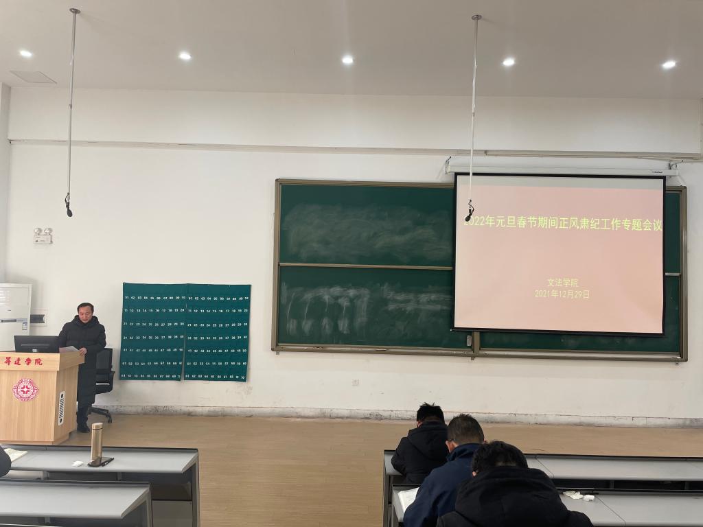 为持续推进正风肃纪,营造风清气正节日氛围,12月29日下午,文法学院组织全体教职工在教学1号楼118教室组织召开2022年元旦春节期间正风肃纪工作专题会议,会议由学院党委副书记、纪检委员赵严俊主持。
