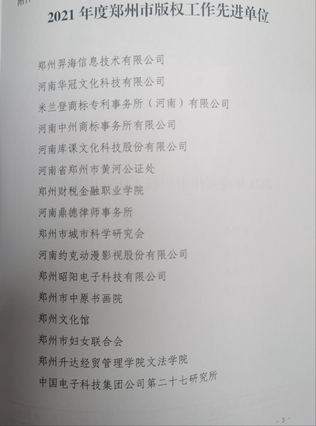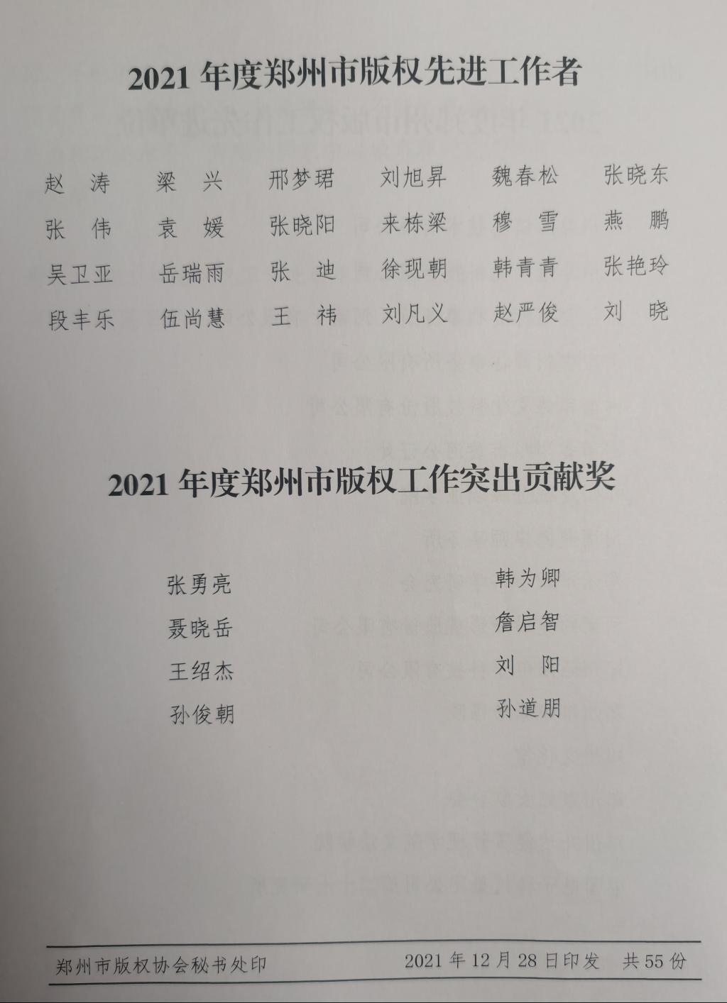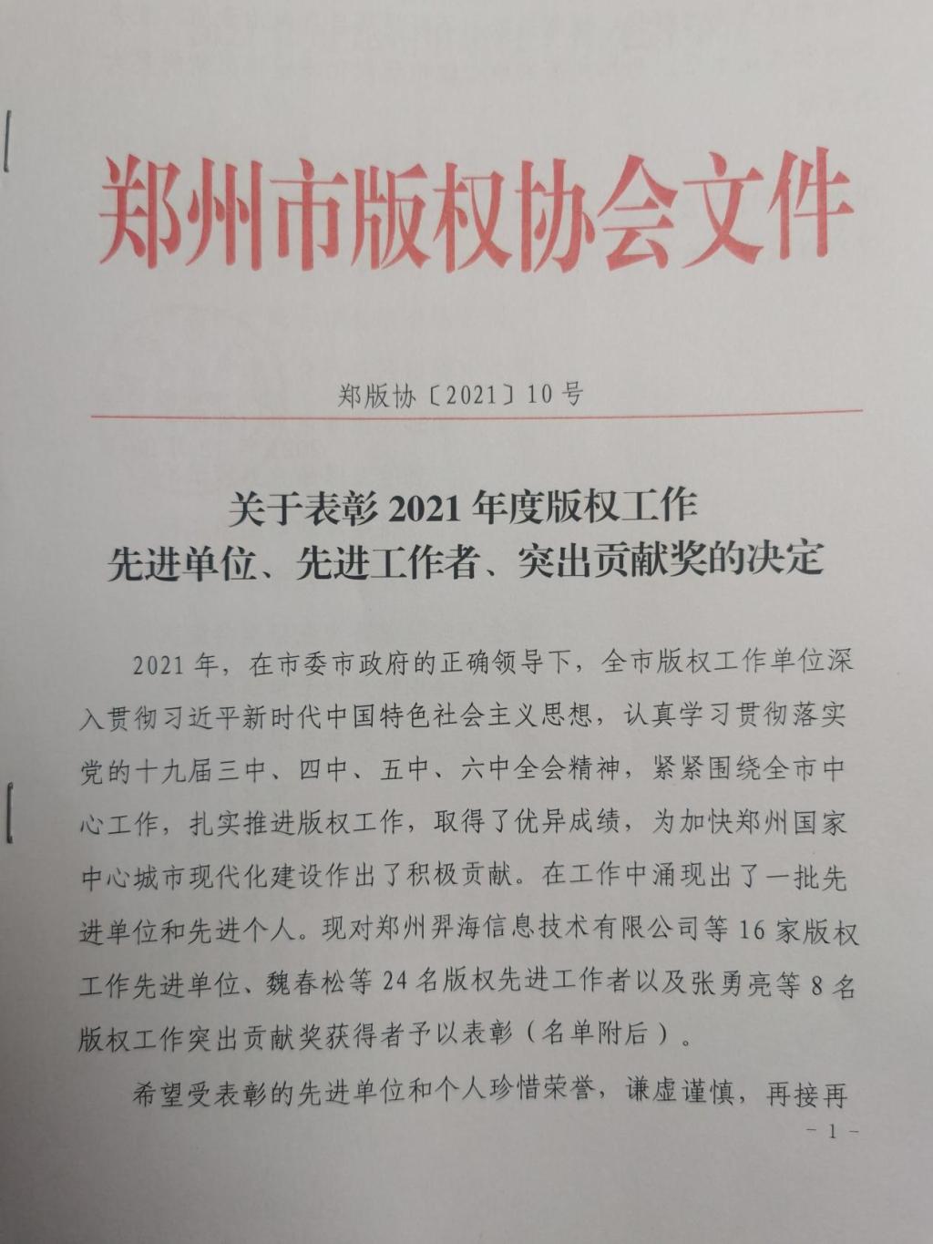 2021年12月28日,郑州市版权协会第三届第四次年会暨2021年度工作总结表彰大会在线上隆重举行。