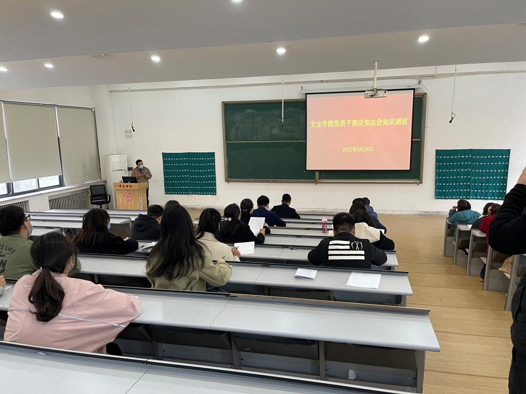 为进一步提升党员干部理论水平,增强理论学习动力,3月24日下午,文法学院在教学1号楼118教室举行党员干部应知应会知识测试,学院领导班子成员、各教研室支部党员、辅导员老师参加测试。