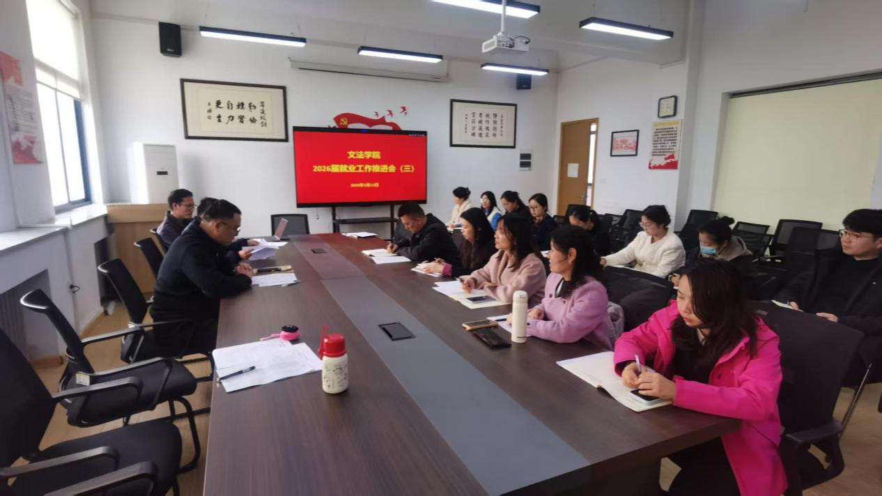 3 月 12 日下午,文法学院在教 1 楼 314 会议室召开 2026 年就业工作第三次推进会,会议由学院党委书记刘晓川主持,全体毕业班辅导员参加。