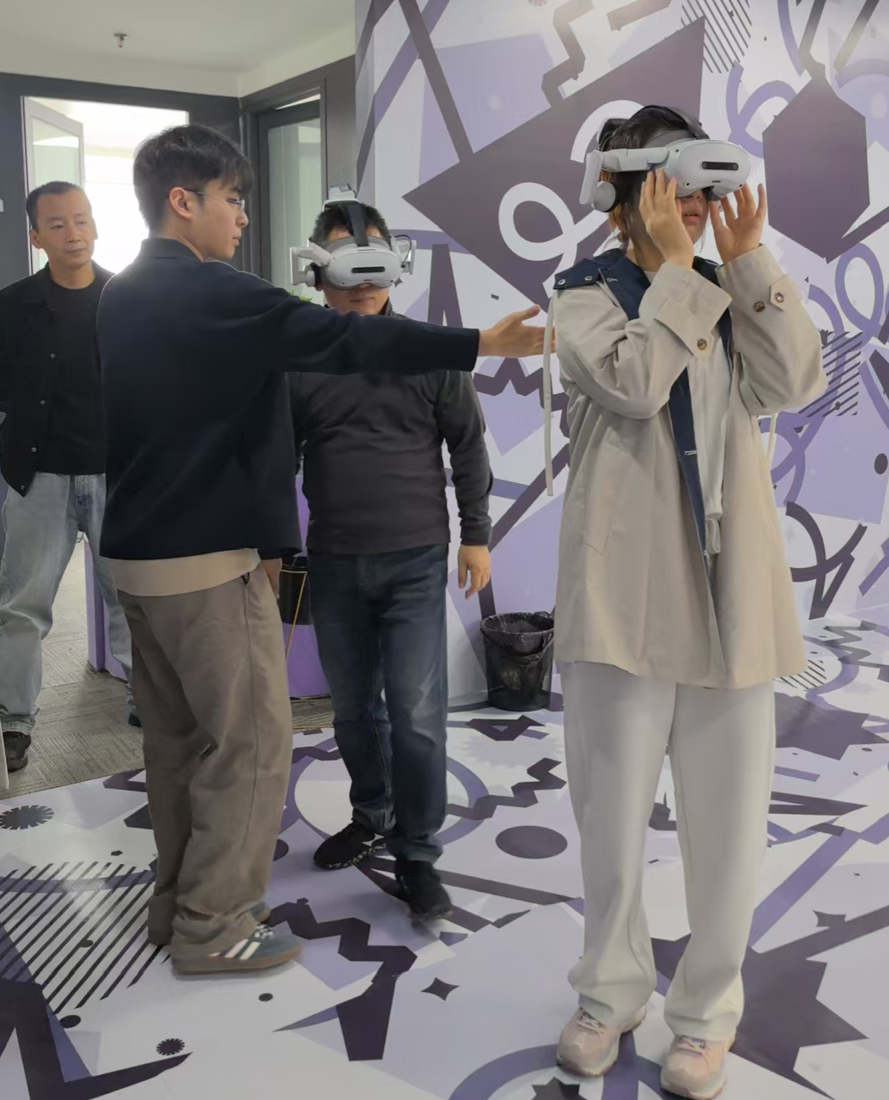 调研团队实地走访了集团数智化内容展示区,近距离感受其在数字化、智能化领域的创新实践。调研团队着重了解了集团在文商旅体和康养少儿领域的创新做法和项目成果,亲身体验了集团推出的“中华文脉VR大空间”系列首部作品《永不消逝的圆明园》,让观众在虚实交织的奇妙体验中,深刻感受园林美学的精妙绝伦与宫廷文化的深厚底蕴。这些“硬核”技术与平台,让在场教师直观感受到数智化对传媒业态的重塑力。