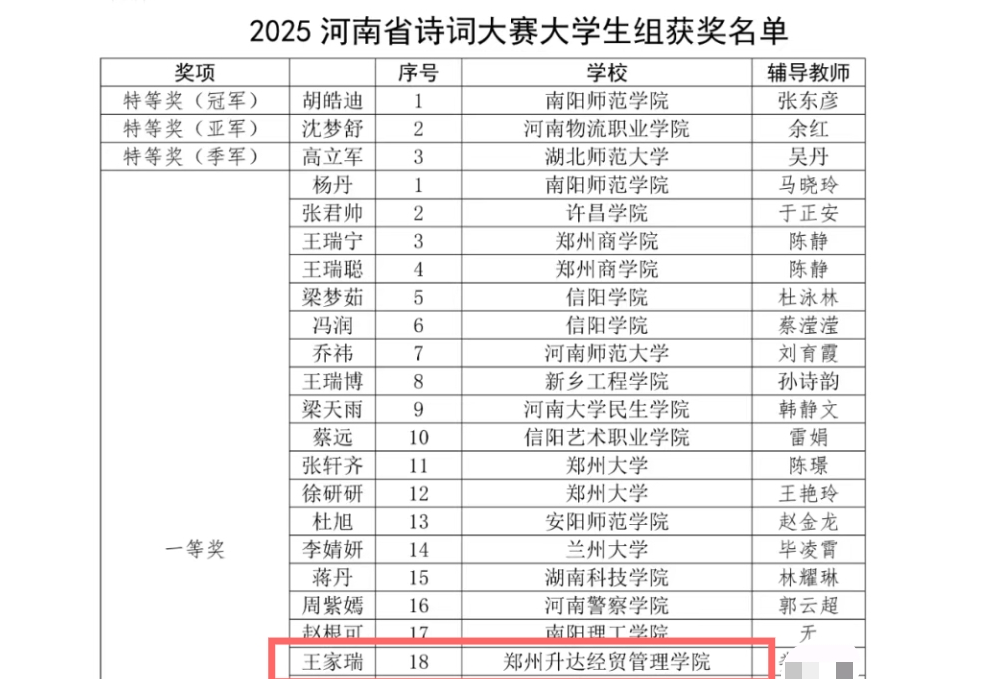 我校学子在“2025年河南省诗词大赛”决赛中荣获大学生组个人赛一等奖